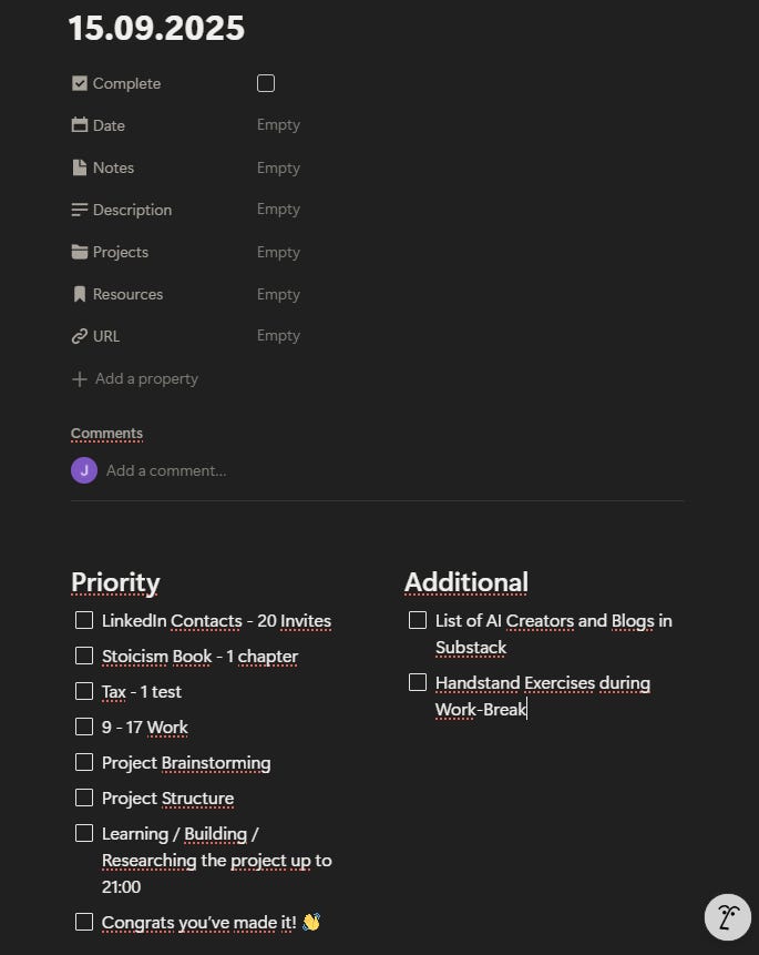 Nothing fancy - just checkboxes for each day with priority tasks from one side, additional ones on the other. The magic isn't in the tool; it's in the routine.